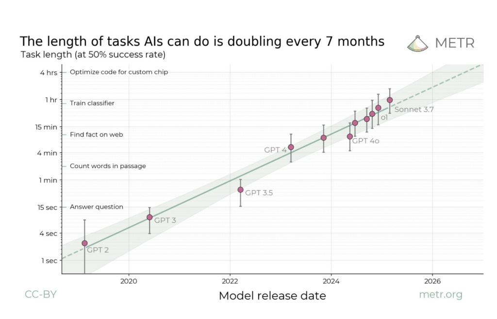Will AI Automate Away Your Job?. It depends. In the short-term, before automation, many office-type corporate jobs will see massive productivity gains, such as software engineering (where over 90% of US-based developers use AI tools in their day-to-day work). The graph below shows the changes in the lengths of time an AI agent can complete autonomously. This represents how long the technology can—like a good employee—operate without external intervention. The trend shows that the length of tasks AI can do is doubling every 7 months.