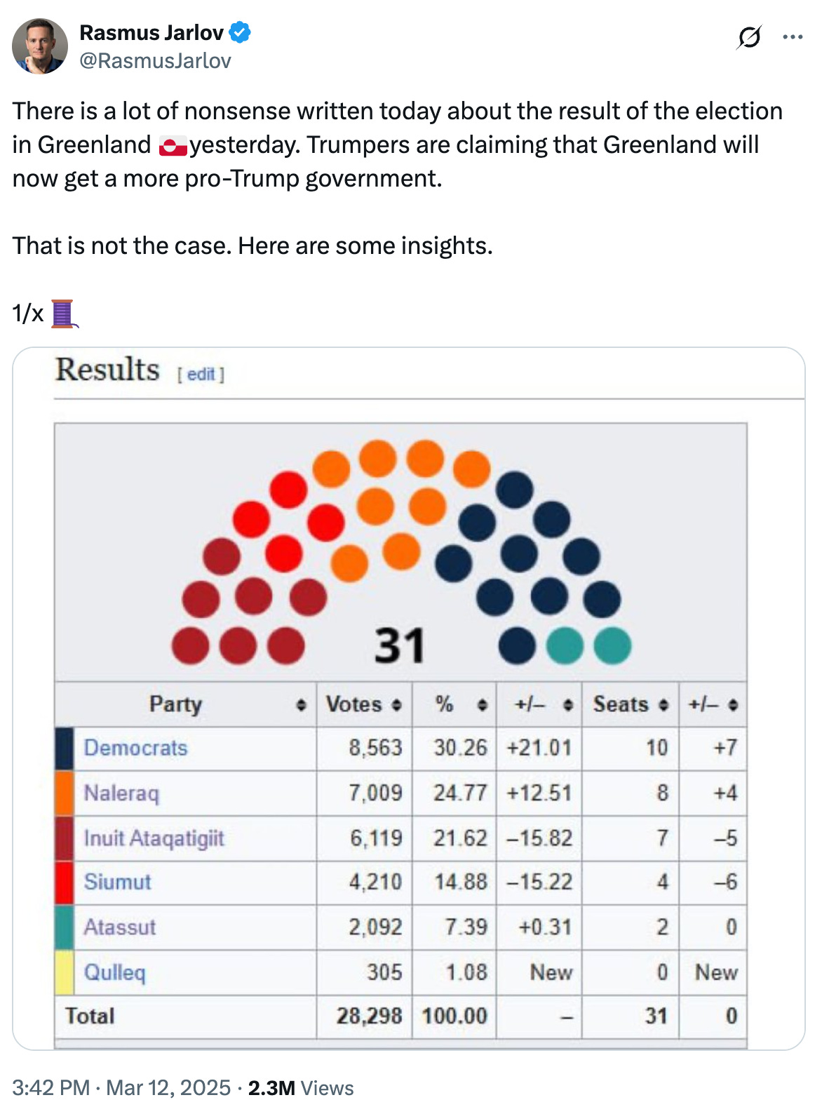 Twitter thread on Greenlands March 11th election that resulted in a win for the Democrats party (free markets center right party who is interested in strengthening their economy first before becoming independent further down the road). Greenland is still not interested in anything to do with the US.