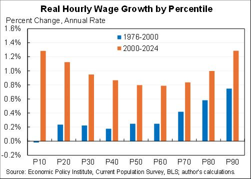 According to Noah Smith, globalization did not hollow out the middle class. This claim is supported by real wage growth over the last quarter century.