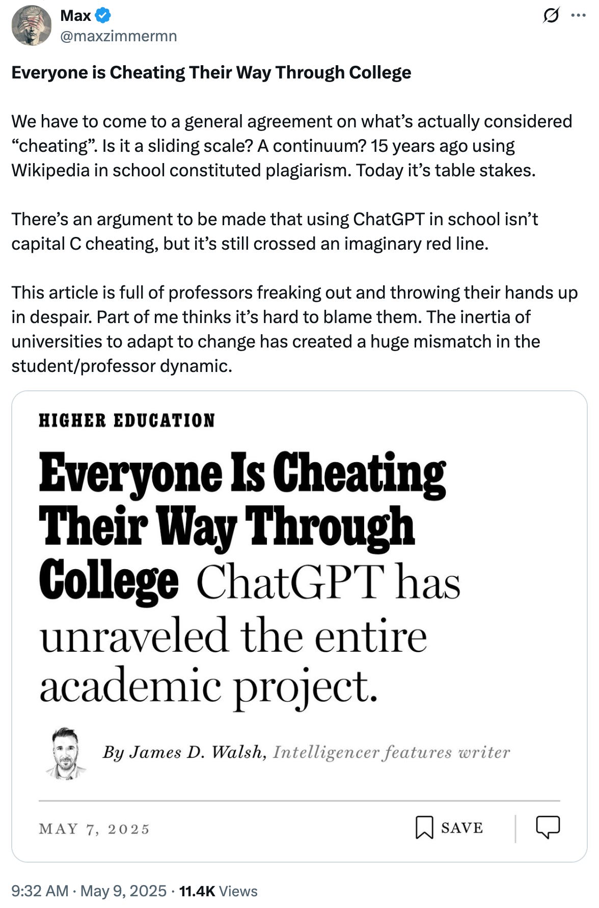 It’s prudent to start asking ourselves and our educational institutions the following question: what scarce human capabilities will rise in value once AGI starts to automate more of our traditional work? Currently students have adapted much quicker to AI vs. their educators. This is an uncomfortable chasm for our educational institutions to find themselves in.